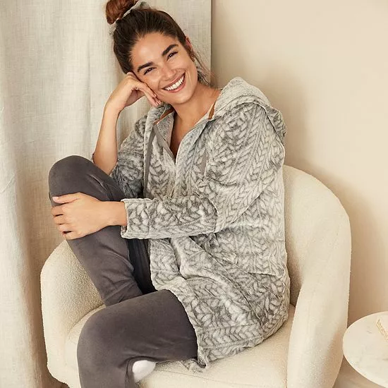 Featuring a cozy plush fabric with faux suede and cable-pattern embossed accents, this women’s Koolaburra by UGG short zipper robe with a Kangaroo pocket abounds with luxurious style.